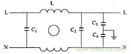 交流電源輸人線上存在以上兩種干擾,通常為低頻段差模干擾和高頻段共模干擾。在一般情況下差模干擾幅度小、頻率低、造成的干擾小;共模干擾幅度大、頻率高, 還可以通過導(dǎo)線產(chǎn)生輻射,造成的干擾較大。若在交流電源輸人端采用適當(dāng)?shù)腅MI濾波器,則可有效地抑制電磁干擾。電源線EMI濾波器基本原理如圖1所示, 其中差模電容C1、C2用來短路差模干擾電流,而中間連線接地電容C3、C4則用來短路共模干擾電流。共模扼流圈是由兩股等粗并且按同方向繞制在一個(gè)磁芯 上的線圈組成。如果兩個(gè)線圈之間的磁藕合非常緊密,那么漏感就會(huì)很小,在電源線頻率范圍內(nèi)差模電抗將會(huì)變得很小;當(dāng)負(fù)載電流流過共模扼流圈時(shí),串聯(lián)在相線上的線圈所產(chǎn)生的磁力線和串聯(lián)在中線上線圈所產(chǎn)生的磁力線方向相反,它們?cè)诖判局邢嗷サ窒?因此即使在大負(fù)載電流的情況下,磁芯也不會(huì)飽和。而對(duì)于共模干擾電流,兩個(gè)線圈產(chǎn)生的磁場是同方向的,會(huì)呈現(xiàn)較大電感,從而起到衰減共模干擾信號(hào)的作用。 這里共模扼流圈要采用導(dǎo)磁率高、頻率特性較佳的鐵氧體磁性材料。