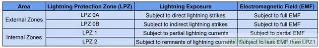 IEC/BS EN 62305避雷防護標準將雷擊風險分為以下三類:直接雷擊;間接雷擊;以及雷擊造成的電磁能量。如表1所示,在避雷防護規(guī)劃中,需要將各區(qū)域劃分為高風險區(qū)域(或稱避雷防護區(qū)域)以及雷擊潛在損害區(qū)域。上述標準將雷擊可能導致的損害分為以下三類:1)活體傷害;2)結構的物理性損壞;3)內部系統(tǒng)的失效。一般而言,對于任何可能給人類造成傷害的事物,均須設置層層預防措施。舉例而言,為了保障內部人員的生命安全,醫(yī)院需要在外部結構和內部設備兩個層面設置大量的緩沖設施。