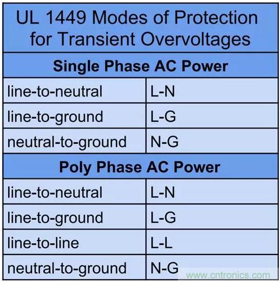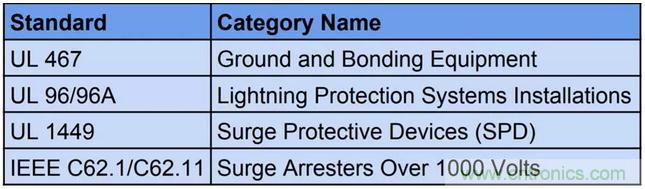 美國保險商實驗室(Underwriter’s Laboratory)所列的數(shù)種避雷防護標準主要針對浪涌保護中采用的設備(見表2)。其中,浪涌保護器件標準UL1449規(guī)定了瞬態(tài)電壓電氣路徑在各種系統(tǒng)供電方式下所需采取的保護模式。