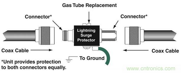 同軸電纜旨在最大限度地減少目標高頻信號因趨膚效應而發(fā)生的歐姆損耗,并同時防止外部導體(或屏蔽層)對內部信號的干擾。趨膚效應是指,隨著頻率的增大,信號的大部分集中于導體外邊緣的一種現(xiàn)象。與電子能在整個導體內自由遷移的交流應用相比,在趨膚效應的作用下,射頻(RF)信號在導體內的穿透深度通常不超過數(shù)個千分之一英寸。因此,人們將60Hz常用的大直徑接地電纜碾平,并將其圍繞于發(fā)送高頻信號的中心導體周圍,以形成同軸電纜,其中,該外圍電纜屏蔽層可作為法拉第罩,防止外部干擾觸及內部信號線。在未接地的情況下,屏蔽層可產(chǎn)生電壓,并用作信號發(fā)射天線。然而,這種精細脆弱的平衡可在雷擊的作用下被打破,這是因為雷擊可同時在同軸電纜的內外導體內產(chǎn)生電勢差。此外,由于雷擊浪涌的大部分能量的頻率為易于被同軸電纜承載的DC~1MHz,因此其可在同軸電纜所連電子設備的工作頻率中產(chǎn)生破壞性的變化。