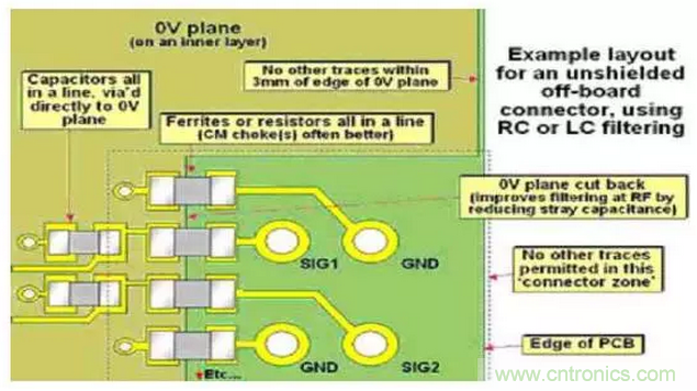5、接口信號(hào)的濾波、防護(hù)、隔離器件等盡可能靠近接口連接器處,相應(yīng)的信號(hào)連接線必須盡可能短(符合工藝要求條件下的最短距離)。