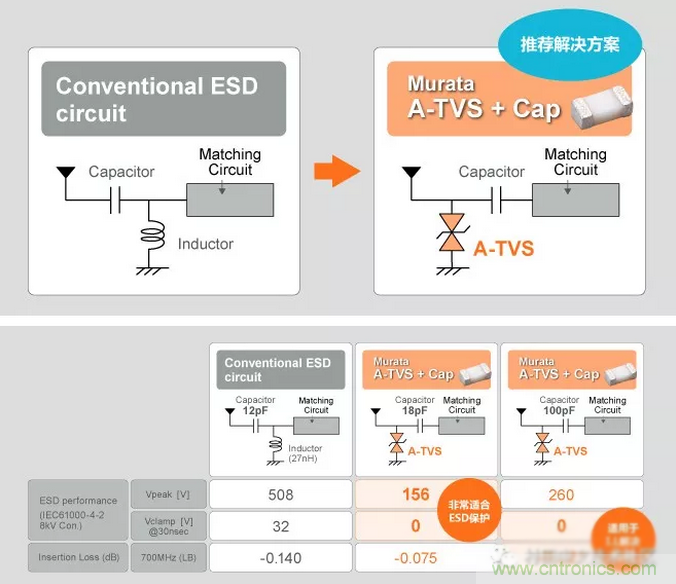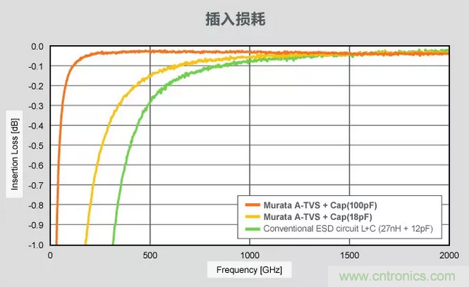 村田的陶瓷ESD保護裝置將A-TVS(LXES**A系列)和電容器組合起來,提高ESD耐性并抑制低頻帶的插入損耗。