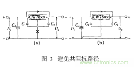 電源線的布置要根據(jù)電流的大小盡量加粗走線寬度。在布線工作的最后,用地線將電路板沒有走線的地方鋪滿(大面積) 。在接地時還需要避免共阻抗路徑,如圖8-10所示穩(wěn)壓器電路的“調(diào)整端的取樣點”或“公共點”,千萬不能接在有負(fù)載電流流過的輸出線和公共地線上如圖(a)所示,應(yīng)從管腳’根部’單獨另外用引線引出如圖(b)所示。
