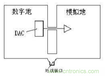 接地技術(shù)中還有一個很重要的部分就是數(shù)字電路與模擬電路的共地處理。一般說來,數(shù)字電路的頻率高,而模擬電路的對噪聲的敏感度強,正因為如此,高頻的數(shù)字信號線要盡可能遠(yuǎn)離敏感的模擬電路器件,同樣,彼此的信號回路也要相互隔離,這就牽涉到模擬和數(shù)字地的劃分問題。一般的做法是,模擬地和數(shù)字地分離,只在某一點連接,這一點通常是在PCB板總的地線接口處,或者在數(shù)模轉(zhuǎn)換器的下方,必要時可以使用磁性元件(如磁珠)連接,如圖所示。