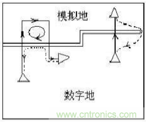 ⑨同時具有模擬和數(shù)字功能的電路板,模擬地和數(shù)字地的電源銅箔通常是分離的;兩種銅箔只在電源處連接。但是這種分離方式就存在一個問題:信號線必須穿越銅皮邊界線。這些邊界線迫使信號回流到器件前首先到達電源。解決的方法是在信號穿越的地線銅箔處放置跳線。這些跳線在分離的銅箔中為信號回路提供橋梁,有助于縮小電流環(huán)路。