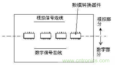 另外,也有一種統(tǒng)一地的處理方法,也就是不進行地分割,但規(guī)定各自的范圍,保證數(shù)字和模擬走線及回流不會經(jīng)過對方的區(qū)域。這種策略一般實用于數(shù)模器件比例相當(dāng),并存在多個數(shù)模轉(zhuǎn)換器件的情況,有利于降低地平面的阻抗,參考地線設(shè)計如圖8-13所示:
