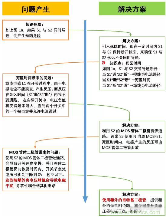 同步開關(guān)穩(wěn)壓器有一個天生的缺陷,就是當(dāng)S1與S2同時導(dǎo)通時,會產(chǎn)生短路危險,這會損壞開關(guān)。所以必須確保兩個開關(guān)永遠(yuǎn)不會同時導(dǎo)通。為了個避免這種情況發(fā)生,會采取一些措施,而這些措施可能會帶來額外的電磁干擾。我們來梳理一下這個過程是如何發(fā)生的。