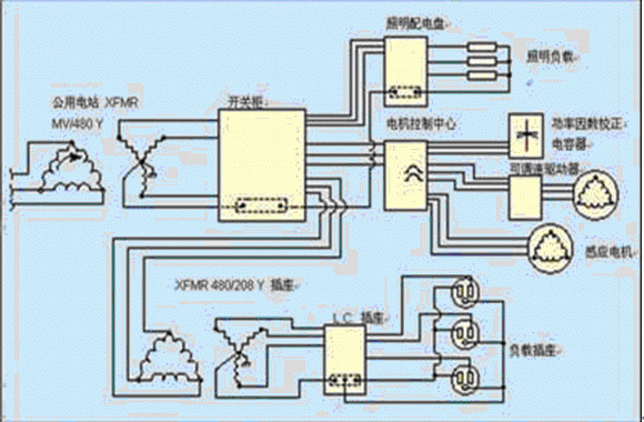 圖1 商業(yè)和工業(yè)設(shè)施中典型的簡(jiǎn)化配電系統(tǒng)。