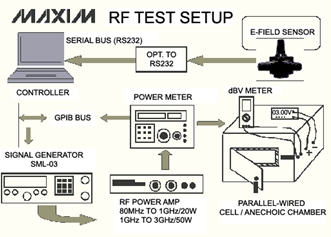Maxim的RF測(cè)試裝置(圖2)產(chǎn)生用于測(cè)試RF抗干擾能力的RF場(chǎng)。測(cè)試電波暗室具有一個(gè)屏蔽室,作用與法拉第腔的屏蔽室類(lèi)似,具有連接電源和輸出監(jiān)視器的端口。把下面列舉的設(shè)備連接起來(lái)就可以組成測(cè)試裝置: