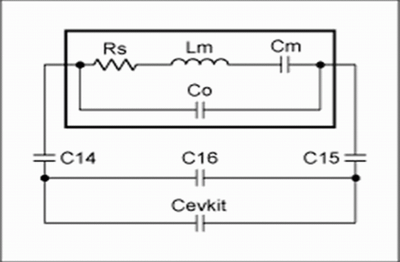 圖3給出MAX1470評估板電路里的晶體圖。在這個(gè)電路中,C14和C15是串聯(lián)牽引電容,而C16是并聯(lián)牽引電容。Cevkit為等效的MAX1470芯片加上評估PCB的寄生電容。Cevkit約為5pF。