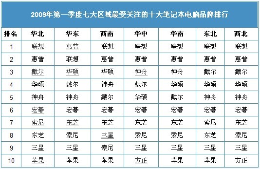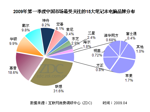 (圖) 2009年第一季度中國市場最受關(guān)注的15大筆記本電腦品牌分布