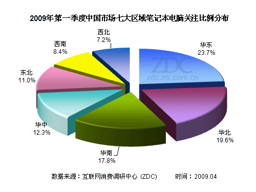 (圖) 2009年第一季度中國市場七大區(qū)域筆記本電腦關(guān)注比例分布