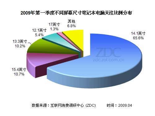 調(diào)查數(shù)據(jù)顯示,14.1是目前最主流的筆記本尺寸,第一季度獲得65.6%的關(guān)注比例。ZDC認(rèn)為,目前14英寸筆記本是各大廠商的主打產(chǎn)品,其產(chǎn)品配置由高到低,可選擇范圍廣,外觀樣式也豐富多彩,同時(shí)經(jīng)典產(chǎn)品更是層出不窮,在價(jià)格方面也要遠(yuǎn)優(yōu)于同性能的12、13英寸筆記本,所以這個(gè)尺寸的筆記本成為主流絕非偶然。