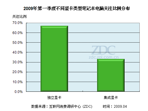 據(jù)ZDC 2009年第一季度的調(diào)查數(shù)據(jù)顯示,獨(dú)立顯卡筆記本更勝一籌,以66.8%的關(guān)注比例領(lǐng)先于集成顯卡機(jī)型。集成顯卡筆記本的關(guān)注比例為33.2%。二者的關(guān)注比例相差較大。