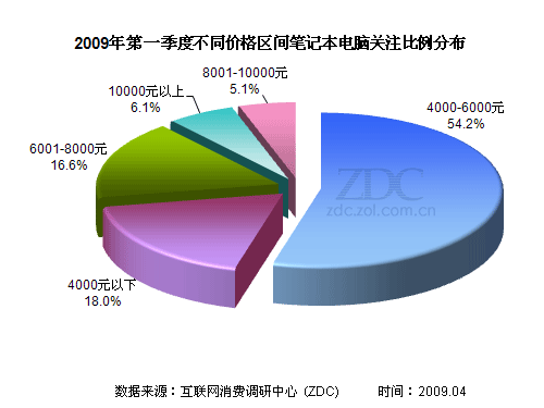 (圖) 2009年第一季度不同價(jià)格區(qū)間筆記本電腦關(guān)注比例分布