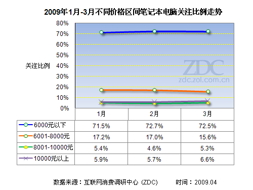 以下是2009年1月到3月不同價(jià)格區(qū)間筆記本的關(guān)注比例走勢狀況。