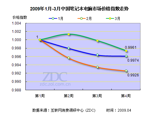根據(jù)ZDC的價(jià)格監(jiān)測數(shù)據(jù)顯示,2009年第一季度筆記本市場的價(jià)格降幅較小,三個(gè)月的價(jià)格指數(shù)均下降了不到1個(gè)百分點(diǎn)。1月份173款筆記本降價(jià)竟是“蜻蜓點(diǎn)水”,最終價(jià)格指數(shù)僅下降了0.39個(gè)百分點(diǎn)。這主要是由于隨著春節(jié)的臨近,多款產(chǎn)品出現(xiàn)缺貨現(xiàn)象:一方面是一些熱門產(chǎn)品本身暢銷、供不應(yīng)求;另一方面是部分經(jīng)銷商囤積居奇,希望狠賺一筆。