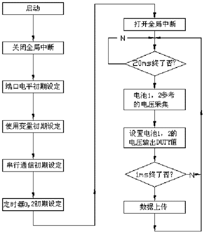 為了驗證本文的均衡充電方法,以兩節(jié)單體電池組成的蓄電池組為例進行實驗和分析,主要驗證旁路中開關管對電壓的調節(jié)作用??刂屏鞒桃妶D4。