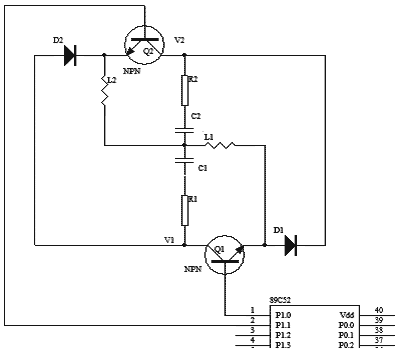 本實驗中,選用兩個小功率NPN管C1815(Q1、Q2)來替代開關管,用89C51芯片的P1.0和P1.1腳控制Q1、Q2的開關。同時,蓄電池的端電壓V1和V2由差動放大電路采集,經(jīng)A/D轉換送到CPU。在整個過程中,電壓每20ms采樣一次,每隔1s上傳上位機并保存并自動繪制曲線。圖5為試驗電路圖。