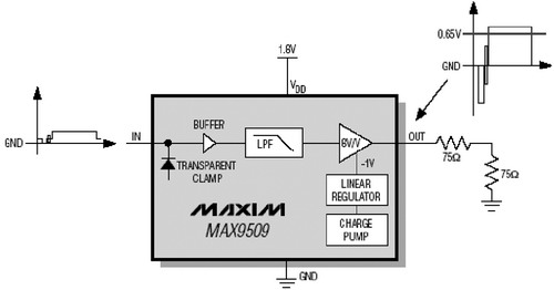 當(dāng)視頻濾波放大器采用1.8V電源電壓工作時(shí),必須采用DirectDrive技術(shù)。采用電壓模式輸出級(jí)的放大器必須至少提供2VP-P擺幅,才能輸出復(fù)合視頻信號(hào)。傳統(tǒng)的放大器采用1.8V單電源供電時(shí),沒有足夠的余量產(chǎn)生2VP-P輸出信號(hào)。而采用DirectDrive后,集成反向電荷泵將產(chǎn)生一個(gè)嘈雜的-1.8V電壓;負(fù)電壓線性穩(wěn)壓器將-1.8V電壓穩(wěn)定到-1V,降低了電荷泵噪聲。因此,實(shí)際采用-1V~+1.8V的電壓供電時(shí),MAX9509剛好有足夠的余量輸出2VP-P視頻信號(hào)。
