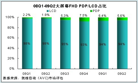 大屏幕等離子產品銷量的增加、全高清技術滲透率的提升,以及大屏幕全高清等離子產品價格的持續(xù)走低等助推了等離子在40英寸以上大屏幕FHD市場占有率由2008年上半年的2.0%,上升至2009年上半年的6.0%,同比增加4.0%。競爭力持續(xù)增強的趨勢已經顯現。
