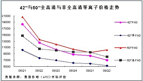 奧維咨詢(AVC)數據顯示:2009年上半年40英寸以上全高清等離子彩電在等離子整體市場占有率為24.6%,比去年同期增加了20.6%。大屏幕全高清等離子市場的高速增長,得益于其產品價格的下降和相對于非全高清產品的價格差距越來越小,替代不可避免。