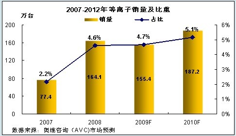 考慮到未來平板電視市場的走勢、結合等離子上下游產業(yè)情況,奧維咨詢(AVC)預測:2009年全年等離子銷量為155.4萬臺,與2008年的總量基本持平。2009年下半年,受液晶市場的規(guī)模優(yōu)勢擠壓,第三、四季度等離子電視的銷量因彩電旺季到來將上升至78.6萬臺,但占市場比重將下降至4.3%。