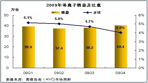 - 2009年上半年等離子電視銷售56.7萬臺,42.1億元,市場份額分別為14.4%和14.5%