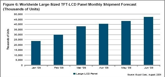 2009年整個(gè)第二季度,全球大尺寸LCD面板出貨量比第一季度上升了43%,比2008年第二季度上升了12%。這應(yīng)歸因于全球經(jīng)濟(jì)好轉(zhuǎn)、中國(guó)市場(chǎng)需求旺盛、新型號(hào)的推出、向16:9面板的轉(zhuǎn)變、以及越來越多地使用LED背光技術(shù)。