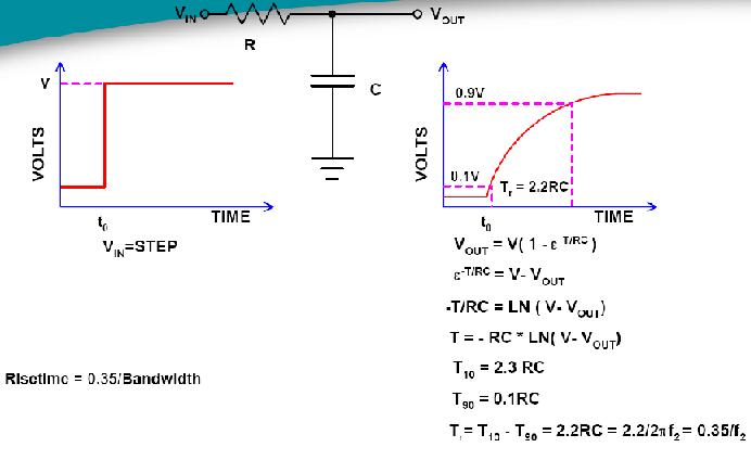 至此,我們知道帶寬f2即輸出電壓降低到輸入電壓70.7%時(shí)的頻率點(diǎn)。 根據(jù)放大器的等效模型,我們可進(jìn)一步推導(dǎo)示波器的上升時(shí)間和帶寬的關(guān)系式,即我們常提到的0.35的關(guān)系:上升時(shí)間=0.35/帶寬,推導(dǎo)過程如下圖6所示。 需要說明的是,0.35是基于高斯響應(yīng)的理論值,實(shí)際測量系統(tǒng)中這個(gè)數(shù)值往往介于0.35-0.45之間。在示波器的datasheet上都會(huì)標(biāo)明“上升時(shí)間”指標(biāo)。 示波器測量出來的上升時(shí)間與真實(shí)的上升時(shí)間之間存在下面的關(guān)系式。 在對快沿信號測試中,需要通過該關(guān)系式來修正實(shí)際被測信號的上升時(shí)間。