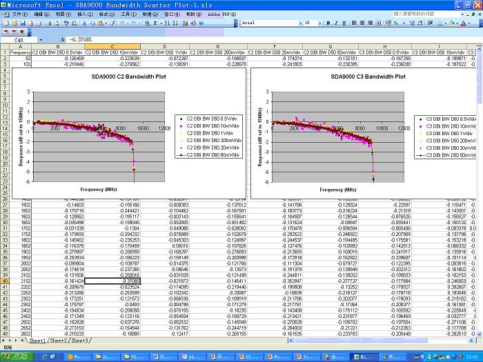 此外,在計(jì)量波特圖時(shí)需要對示波器每個(gè)檔位都進(jìn)行計(jì)量,最終產(chǎn)生的波特圖是所有檔位的結(jié)果疊加在一起的。波特圖的計(jì)量是需要半天時(shí)間完成的,并不是想象中那么輕松的工作。如圖8所示是力科SDA9000的波特圖,我特地將Excel中大量數(shù)據(jù)顯示給大家以使大家對校準(zhǔn)的嚴(yán)謹(jǐn)性有深刻認(rèn)識。 其垂直軸是-1dB/div, 疊加了10mv/div、20mv/div、50mv/div、200mv/div、500mv/div、1v/div等檔位的測試結(jié)果。 很多時(shí)候,我們的競爭對手會(huì)把他們的波特圖畫成-10dB/div、只有一個(gè)檔位的測試結(jié)果拿給客戶,并和力科提供的這種-1dB/div、各種檔位疊在一起顯示的結(jié)果放在一起進(jìn)行對比,然后他們告訴客戶,他們的波特圖更平坦,更干凈,甚至將力科波特圖上面密密麻麻的點(diǎn)說成是“噪音”大。這是有點(diǎn)貽笑天下的。 競爭對手敢于一再采用這種做法,這是假設(shè)中國的工程師都沒有辨別力,獨(dú)立思考能力,是對工程師嚴(yán)重不尊重的公然欺騙行為。希望能引起大家注意。