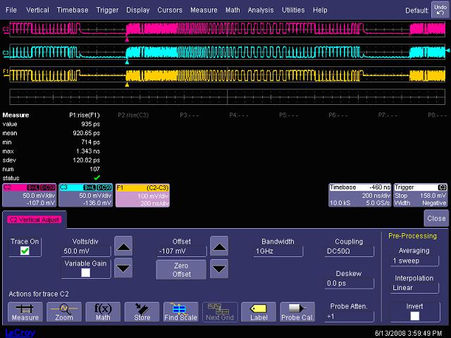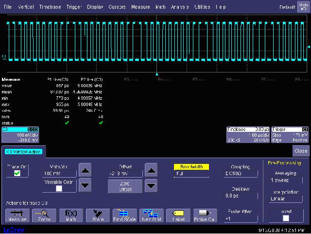 我們知道,帶寬的限制對信號的捕獲會(huì)帶來下面的影響:1,使被測信號的上升沿變緩。2,使信號的頻率分量減少。3,使信號的相位失真。 那么,“對于5MHz的時(shí)鐘信號,需要用多少帶寬的示波器來測量?” 這是我在培訓(xùn)時(shí)常問的一個(gè)問題。我很少能得到令我滿意的答案,很少有工程師反問我:“這5MHz的時(shí)鐘信號是方波還是正弦波,如果是方波,其上升時(shí)間是多少?” 我常得到的回答是,“100MHz帶寬就足夠了,示波器帶寬通常是被測信號頻率的3-5倍,100MHz余量很大了。” 圖13顯示了5MHz的方波信號在不同帶寬時(shí)測試出的波形。其中,M1和M2是分別在6GHz和1GHz時(shí)波形,C3是帶寬限制到200MHz的測試結(jié)果。 圖14顯示在帶寬限制到200MHz時(shí)測量出的5MHz的上升時(shí)間均值為本1.70357ns,而圖15顯示的是在6GHz帶寬時(shí)的上升時(shí)間為873.87ps。這表明,對于 5MHz的時(shí)鐘,因?yàn)槠渖仙龝r(shí)間比較快,最好用1GHz以上帶寬的示波器來測量其上升時(shí)間,200MHz時(shí)其上升沿變緩; 1GHz帶寬和6GHz帶寬對于測試800ps的上升時(shí)間結(jié)果幾乎一樣。