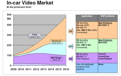 除了IDB-1394或者MOST等車內(nèi)多媒體的網(wǎng)絡技術(shù),車用的視頻處理器SoC市場也將在未來的數(shù)年內(nèi)呈現(xiàn)高速增長,CAGR將達到21.4%,其中高端SoC的年平均增幅接近50%。NXP半導體汽車電子事業(yè)部的技術(shù)和應用市場經(jīng)理徐偉杰表示,高端處理器能夠解碼高清和標清的視頻內(nèi)容、支持藍光格式、接收全球不同的數(shù)字電視信號,并且應該具備高級的HMI和導航系統(tǒng)以及網(wǎng)絡聯(lián)接。而中端的產(chǎn)品應該支持標清內(nèi)容的解碼、地面數(shù)字電視和DVD播放等。