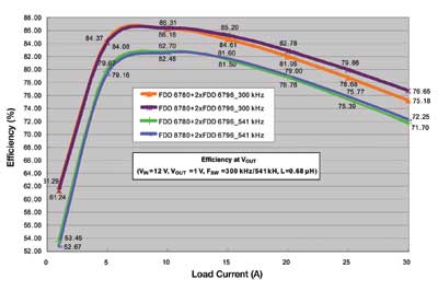 注意上面的兩條曲線,在滿載(30A)時(shí),可以看到最新的器件的效率有1.5%的改進(jìn)。同樣還是這兩條曲線,在負(fù)荷較小(15A)時(shí),可以實(shí)現(xiàn)0.69%的改善。如果對(duì)整個(gè)負(fù)荷范圍積分,那么與今天常見的方案相比,使用最新的MOSFET器件時(shí)平均功率損耗可以降低8%~10%。即使在較高的開關(guān)頻率541kHz處,可以看到在負(fù)荷小時(shí)系統(tǒng)級(jí)效率仍然高于80%,而在滿載時(shí)效率大于70%。如果頻率繼續(xù)增加,那么開關(guān)損耗將急劇增加。