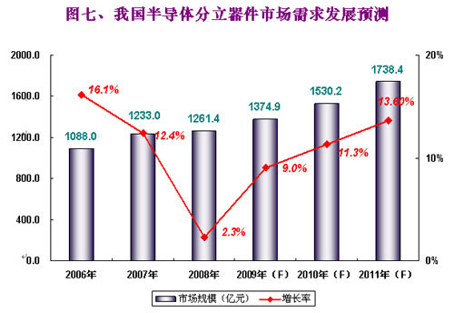 2008年我國分立器件產(chǎn)銷的一大亮點(diǎn)主要得益于全球電子整機(jī)對(duì)節(jié)能、環(huán)保需求的不斷增長,這一方面帶動(dòng)了分立器件產(chǎn)品的需求增長,另一方面也帶動(dòng)了市場(chǎng)產(chǎn)品結(jié)構(gòu)的快速升級(jí)。銷售額在LED產(chǎn)業(yè)大幅增長的帶動(dòng)下仍增長了12.3%,在二極管、三極管增速相對(duì)平穩(wěn)之時(shí),而以MOSFET和IGBT為主的功率晶體管的廣泛應(yīng)用于PC、筆記本電腦、計(jì)算機(jī)電源配件、液晶電視等而得到提升。2008年我國分立器件產(chǎn)量達(dá)到2461.13億只,同比下降1.1%;2008年我國分立器件銷售額達(dá)到937.8億元,同比增長12.3%。(CSIA、CCID年度報(bào)告)