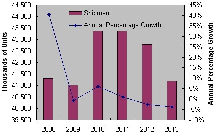 經(jīng)過(guò)數(shù)年高達(dá)兩位數(shù)甚至三位數(shù)的擴(kuò)張之后,2009年全球PND出貨量預(yù)計(jì)比2008年下降0.7%。在未來(lái)四年內(nèi),全球銷售量預(yù)計(jì)將保持平穩(wěn),2013年預(yù)計(jì)為4,120萬(wàn)個(gè),幾乎與2008年持平。