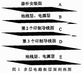 采用多層布線方式,電源、地線和信號分別占有獨立的層面(如圖1所示),這樣由整個層面構(gòu)成的電源線和接地線阻抗相當(dāng)?shù)?。電路板的分布電容由各層之間的距離和介電系數(shù)來決定,約為10~1000pF/cm2。圖1中的E層上下表面經(jīng)過絕緣處理,既能預(yù)防線路板向外輻射噪聲,又能防止線路板接受外來噪聲;同時,電源線被密封在板內(nèi),幾乎不接受任何外來噪聲,而且內(nèi)部幾個供電面之間有很大的靜電電容,形成阻抗極低的供電線路,極大地提高了抗噪性能。