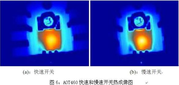 圖6為AOT460在同一應用中快速開關和慢速開關情況下的熱成像照片??梢钥闯?,在慢速開關情況下MOSFET的局部溫度要高于快速開關情況下的溫度,過慢的開關速度會導致MOSFET因局部溫度過高而提前失效。