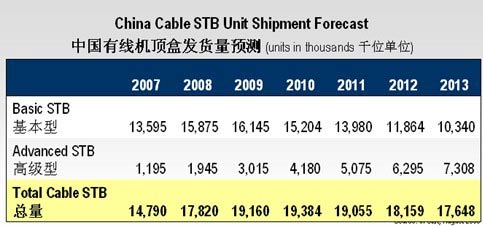 中國有線電視的數(shù)字化整轉(zhuǎn)工作在各地區(qū)相繼展開,截止目前已經(jīng)發(fā)展到6000萬戶。機(jī)頂盒市場也在整轉(zhuǎn)數(shù)字的增長中呈現(xiàn)出兩極化發(fā)展的趨勢。全球有/無線通訊半導(dǎo)體市場的領(lǐng)導(dǎo)者博通公司,日前在ICTC的研討會(huì)上發(fā)表了其對(duì)于中國有線機(jī)頂盒市場發(fā)貨量的預(yù)測。在預(yù)測中他們認(rèn)為,基本型的機(jī)頂盒發(fā)貨量將從2010年開始萎縮,而高級(jí)型的機(jī)頂盒發(fā)貨量將節(jié)節(jié)攀升,到2013年的年發(fā)貨量將增至730.8萬。