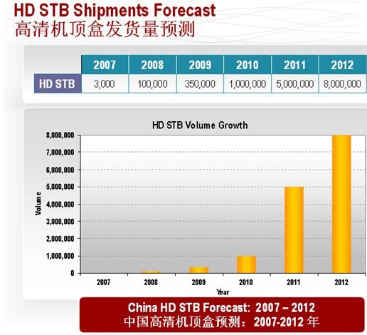 此外,博通特別對(duì)高清機(jī)頂盒市場做了分析。寬帶通訊事業(yè)部資深市場總監(jiān)JohnGleiter說,由于政府大力推進(jìn)高清內(nèi)容進(jìn)入消費(fèi)者市場,預(yù)示著中國的高清機(jī)頂盒產(chǎn)業(yè)正式破冰啟航。與此同時(shí),廣電總局要求的九套免費(fèi)高標(biāo)清同播的衛(wèi)視節(jié)目將從現(xiàn)在開始不斷完善。在總局內(nèi)容高清化的時(shí)間表中,到2010年,這五套衛(wèi)視的所有節(jié)目都需實(shí)現(xiàn)高、標(biāo)清同播,這就打開了之前制約高清電視發(fā)展的內(nèi)容瓶頸。而高清平板電視機(jī)的普及更為高清大發(fā)展迎來了契機(jī)。目前70%的平板電視機(jī)是高清或全高清兼容的,這就意味著購買高清電視機(jī)的消費(fèi)者將成為運(yùn)營商挖掘的潛在用戶。單一的數(shù)字化整轉(zhuǎn)運(yùn)營商需要大量的成本投入,現(xiàn)在很多運(yùn)營商將未來的盈利模式都鎖定在高清和互動(dòng)兩個(gè)方面,所以未來可能有更多的運(yùn)營商考慮“高清轉(zhuǎn)換”,這就帶來了有線高清機(jī)頂盒將在2010年大幅增長的趨勢。In-Stat預(yù)測,到2010年末將交付50萬臺(tái)先進(jìn)的有線電視機(jī)頂盒,這些機(jī)頂盒都將具有高清處理能力。