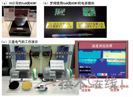 為了降低成本,使用Si底板的展出接連不斷。IR展出了形成有GaN類HEMT的晶圓(a)。羅姆也首次試制使用Si底板的GaN類HEMT并展出了電源模塊(b)。三墾電氣使用配備有6個SBD內(nèi)置GaN類FET的逆變器驅(qū)動200V、2.2kW的3相交流馬達,與利用配備Si制IGBT和FRD的逆變器進行驅(qū)動時逆變器表面溫度的變化進行了比較(c)。左側配備GaN元件的逆變器損失小且溫度低。美國國際整流器公司(International Rectifier,IR)宣布在2009年內(nèi)投入實用。首先投產(chǎn)的將是使用耐壓僅為數(shù)十V的GaN類HEMT的POL電源模塊,為無需加載柵極電壓即可導通的“常開”型。