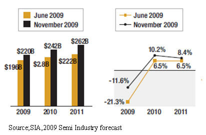 SIA在今年6月時(shí)曾預(yù)測(cè)09年全球半導(dǎo)體業(yè)下降21%,銷售額為1956億美元,緊接著2010年增長(zhǎng)6.5%,為2083億美元及2011年達(dá)到2219億美元。
