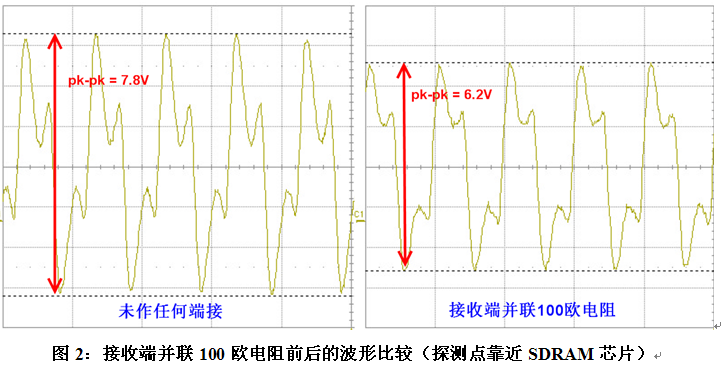 幾天后,我們?cè)趯?shí)驗(yàn)室重新測(cè)試了該系統(tǒng)的時(shí)鐘,測(cè)試儀器為SDA816Zi(帶寬16G,采樣率40G),探頭為ZS1500(帶寬1.5GHz)。由于待測(cè)試信號(hào)頻率僅為100MHz,所以通常1G以上示波器和探頭足以滿足需求(注:對(duì)于某些上升時(shí)間很快的時(shí)鐘,比如PCIExpress的100MHz時(shí)鐘,1GHz的帶寬是不夠的,需要更高帶寬的示波器)。下圖2左圖為未作端接時(shí)在SDRAM芯片端測(cè)量時(shí)鐘波形,右圖為靠近SDRAM顆粒并聯(lián)100歐電阻后的波形,兩者相比,前者的過沖高達(dá)7.8V,電路板不能正常工作;而后者過沖較小,電路板可以正常工作。