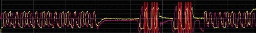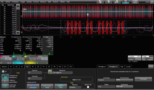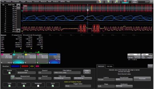 WaveScan把測量過濾中所有符合測量標(biāo)準(zhǔn)的波形累積起來形成掃描疊加的軌跡圖(圖2中間的軌跡)。這幅余輝圖包含了全部捕獲的歷史波形軌跡。我們現(xiàn)在就可以對被選擇出來的整個波形組在掃描疊加軌跡圖上應(yīng)用測量參數(shù)進(jìn)行測量。你也可以在被選擇波形的縮放軌跡上應(yīng)用測量參數(shù)進(jìn)行測量。