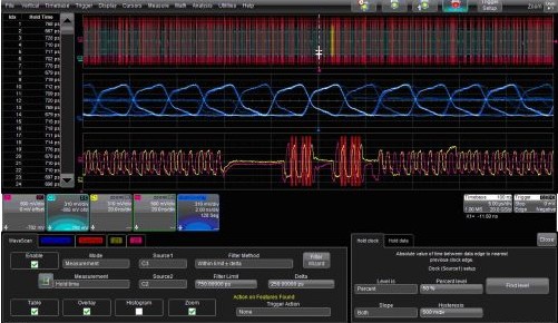 力科的WaveScan波形搜索與掃描特性可以通過選擇Strobe和掃描疊加(ScanOverlay)圖中滿足條件的波形之間的時序關(guān)系找出Data信號。圖2是這種功能的一個例子。WaveScan的對話框設(shè)置為搜索建立時間(Hold Time)在500ps到1ns(750 ±250 ps)之間的波形。對話框右邊的標(biāo)簽用來鑒別Strobe和Data信號。注意“Hold Clock”和“Hold Data”兩個對話框標(biāo)簽,測量是對這兩個信號邊沿設(shè)定的。