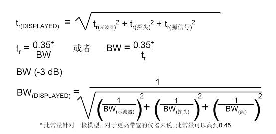 以上公式中,Tr(display)表示實際測量到的信號上升時間,等于示波器上升時間、探頭上升時間和源信號上升時間的正交和。而系統(tǒng)的上升時間與帶寬的乘積為一常數(shù),對系統(tǒng)函數(shù)為1階的模型而言,該常數(shù)經(jīng)驗值為0.35,對于更高階的模型該常數(shù)介于0.35 ~ 0.5之間。 我們可以推導出這四者帶寬之間的關系。從以上公式我們還可以推導出:如果我們使用一臺100MHz的示波器和一個100MHz的探頭,那么它們組成的系統(tǒng)帶寬就小于100MHz,內(nèi)在的因素是因為探頭的電容和示波器的輸入電容相加,更大的電容導致更小的系統(tǒng)帶寬,加大了顯示在示波器屏幕上信號的上升時間tr。