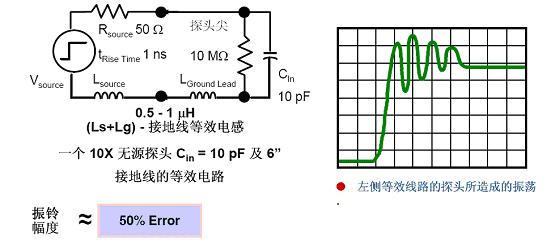 探頭接地引線實質(zhì)可以等效為電感效應,接地引線電感與探頭及示波器的輸入電容形成串聯(lián)諧振電路。而探頭的輸入電阻則在諧振電路中引入阻尼。電感效應會造成阻抗不匹配,而且是帶寬越大影響就越大。等效電感的大小與接地線長度有關,其越長電感效應就越大,對波形的破壞效應就是會產(chǎn)生脈沖信號的振蕩、過沖等信號完整性問題帶有接地引線電感的示波器探頭等效電路及效應如下圖4。