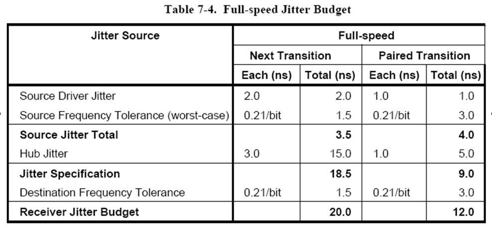 USB2.0是一種復(fù)雜的總線結(jié)構(gòu),既包括高速、全速、低速三種速率級(jí)別,也包括主機(jī)、設(shè)備、集線器三類產(chǎn)品,每種類別又包括多個(gè)參數(shù)需要測(cè)試,幅度、抖動(dòng)、時(shí)序、過(guò)程等特性都需要一一分析是否滿足規(guī)范要求。USB2.0一致性測(cè)試規(guī)范對(duì)HighSpeed的Device分析就定義了幾十個(gè)參數(shù)。每一種參數(shù)的測(cè)量對(duì)于示波器的使用都定義了設(shè)置參數(shù),如下1就是USB-IF對(duì)全速抖動(dòng)測(cè)試的容限范圍規(guī)定: