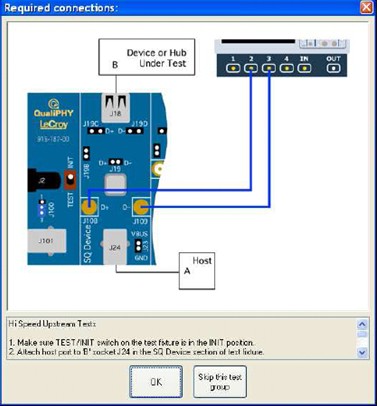 QualiPHY軟件的用戶界面設(shè)計(jì)非常人性化和直觀實(shí)用,它會(huì)以圖表化的方式顯示出一致性測(cè)試的每個(gè)環(huán)節(jié)中測(cè)試夾具、示波器主機(jī)和DUT三者之間的拓?fù)潢P(guān)系,使用者無(wú)需記憶,就能正確設(shè)置測(cè)試環(huán)境。下圖4清晰 顯示了USB2.0高速設(shè)備信號(hào)質(zhì)量測(cè)試中的夾具、DUT和示波器連接關(guān)系。