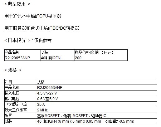 長期以來,瑞薩一直在提供符合DrMOS標準的一系列產(chǎn)品,尤其是輸出電壓為12V的服務(wù)器和臺式電腦。新的R2J20653ANP將可承載的輸入電壓擴展到適用于筆記本電腦的20V適配器電壓,成為瑞薩高電壓容限電源類的首款產(chǎn)品。這款產(chǎn)品的推出有助于筆記本用CPU電源在實現(xiàn)更加小型化的同時,達到更高的性能,并且有望帶動DrMOS標準更加廣泛的應用。